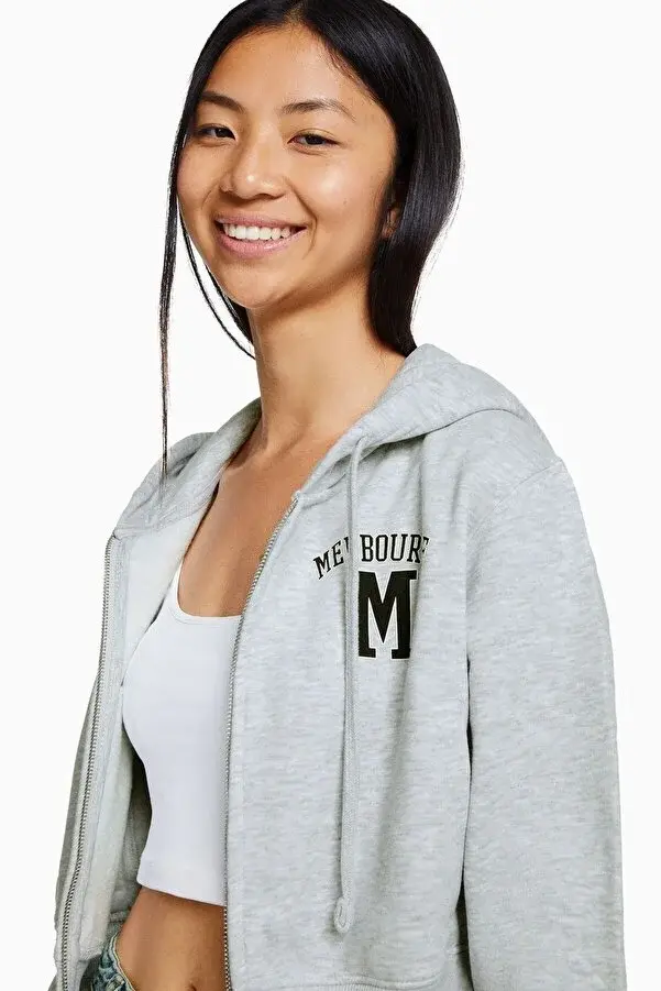Bershka Desenli fermuarlı crop kapüşonlu Kadın sweatshirt