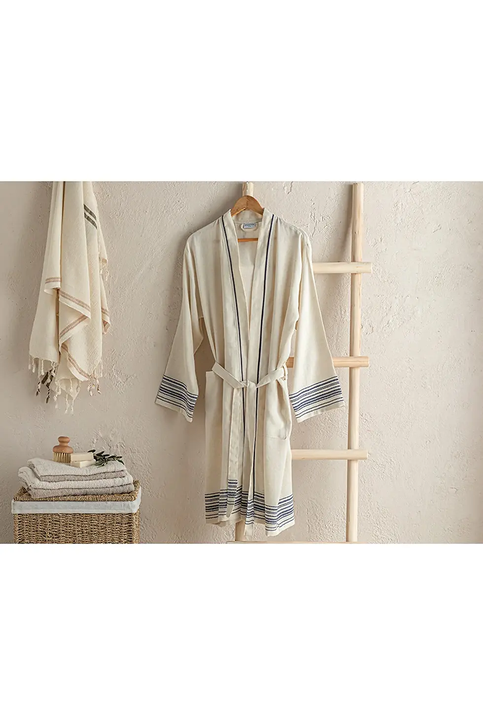 English Home Lola Pamuk Keten Peştamal Bornoz Bej-Lacivert